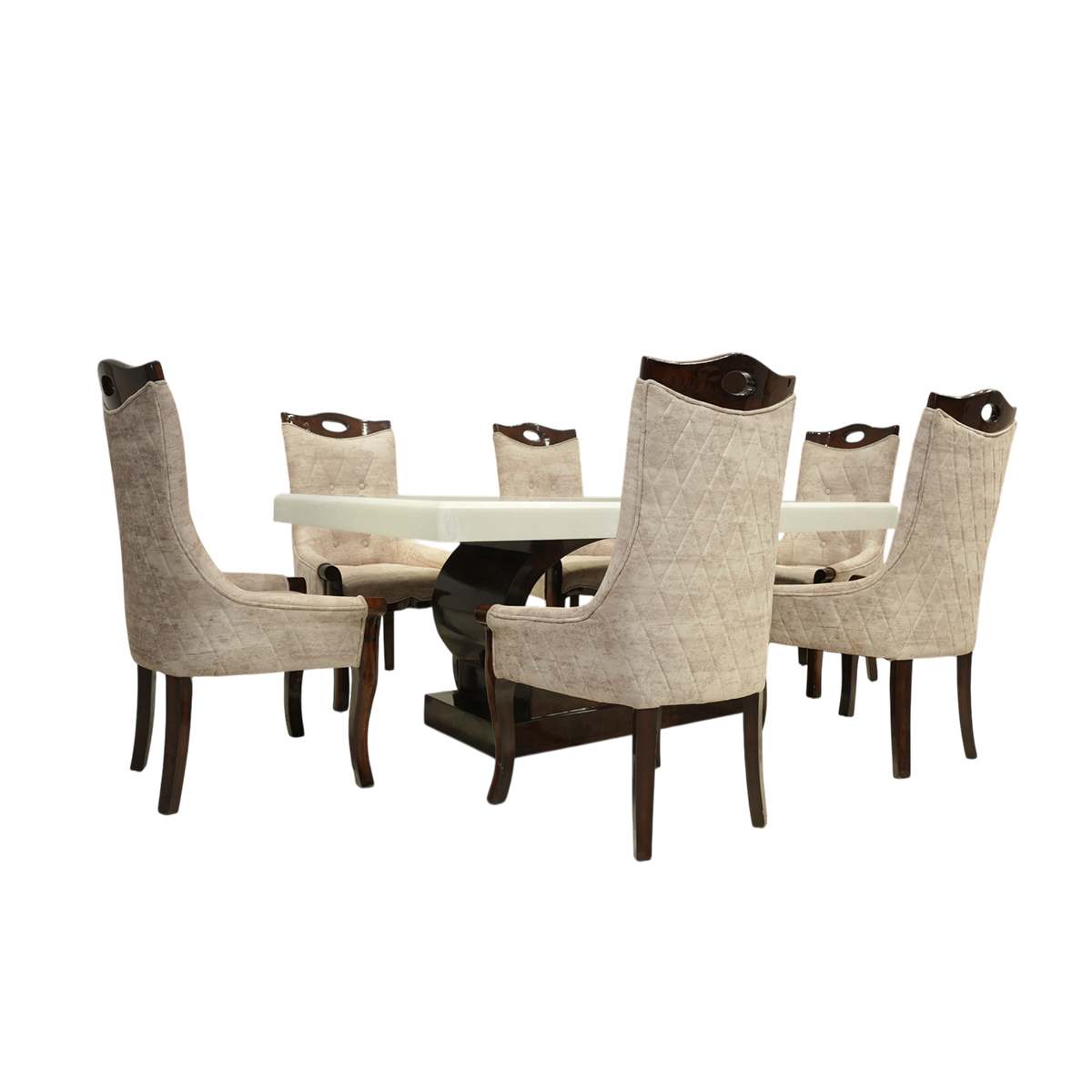 This dining set seamlessly blends luxury materials to create a sophisticated centre piece that enhances any dining environment. The combination of warm teak wood, cool marble, and plush suede creates a perfect balance of textures and visual appeal. The set is designed to accommodate both casual family meals and formal dining occasions, providing comfort, durability, and unmistakable style.