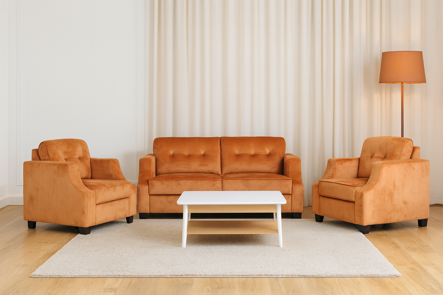 This 20/2B Sofa set in a 3+1+1 configuration offers a perfectly balanced seating solution with one three-seater sofa and two matching single armchairs for comprehensive living room comfort. The collection features contemporary design elements with quality construction and premium upholstery that ensures both style and durability for everyday use. Each piece in the 20/2B series is crafted with attention to detail and comfortable proportions that make it suitable for both casual family time and formal entertaining. The coordinated design creates visual harmony throughout the set while providing flexible seating arrangements to accommodate various room layouts and guest configurations. This versatile furniture ensemble combines modern aesthetics with practical functionality, making it an ideal choice for homes that value reliable quality and timeless appeal in their living spaces.