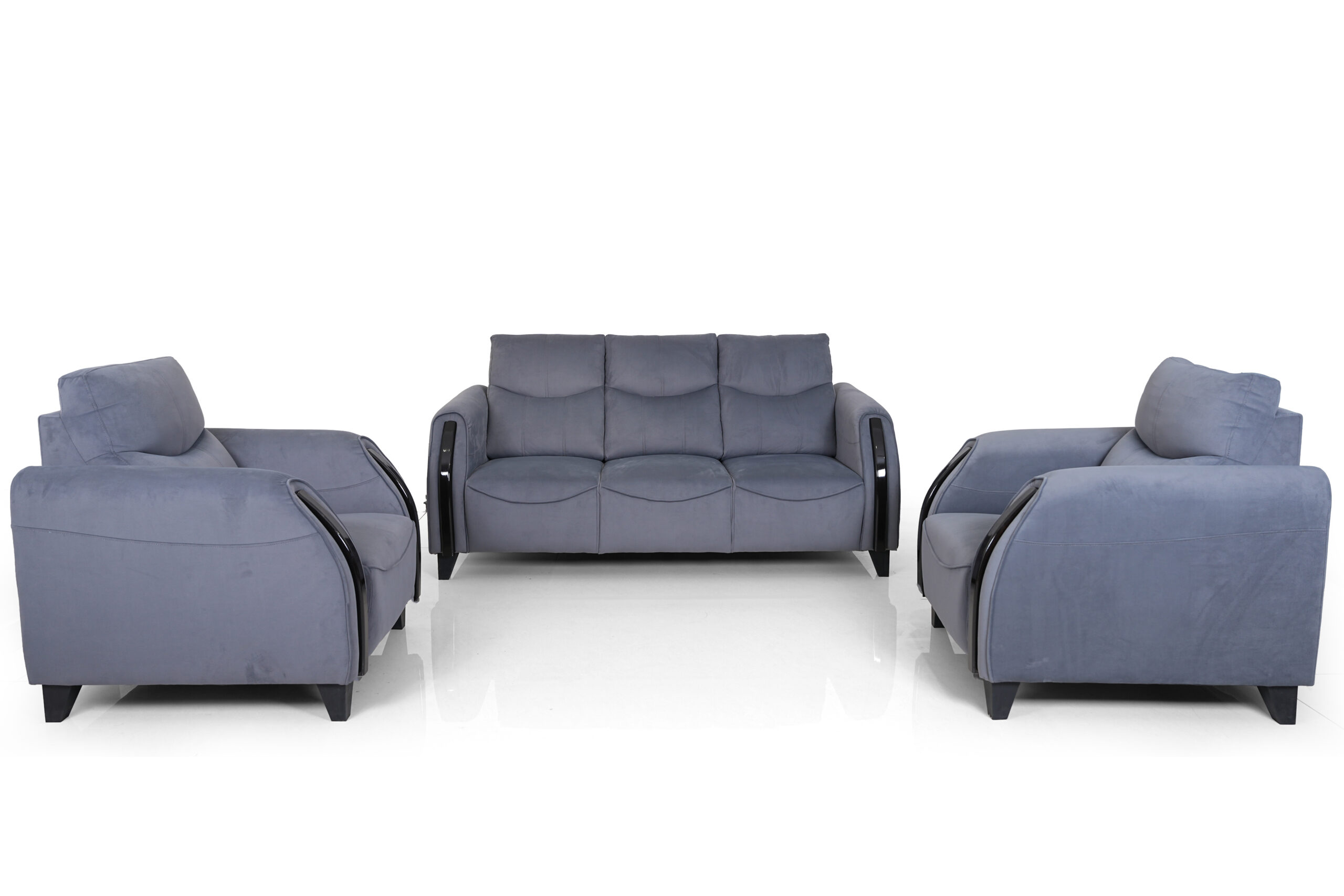 A luxurious sofa set upholstered in smooth suede-feel fabric, crafted with kiln-dried, precision-built wood for lasting strength. Supported by sturdy fibre legs, it delivers a perfect balance of elegance, comfort, and durability for modern living spaces.